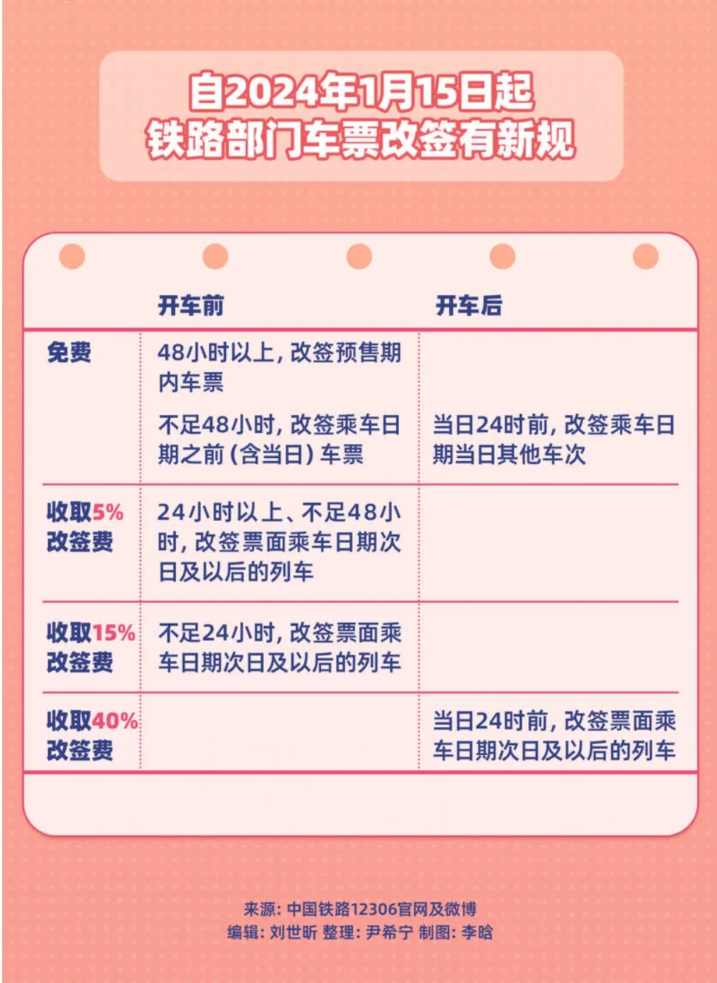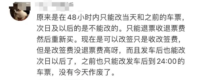 出台新规后,在原车票车次开车时间的48小时以内都可以改签,甚至可以改签预售期内的车票。“通俗一点说,距离开车前不足48小时时,改签票面乘车日期及以前的列车,或者开车后在当日24时之前改签当日其他列车时,都是不收取改签费的。”